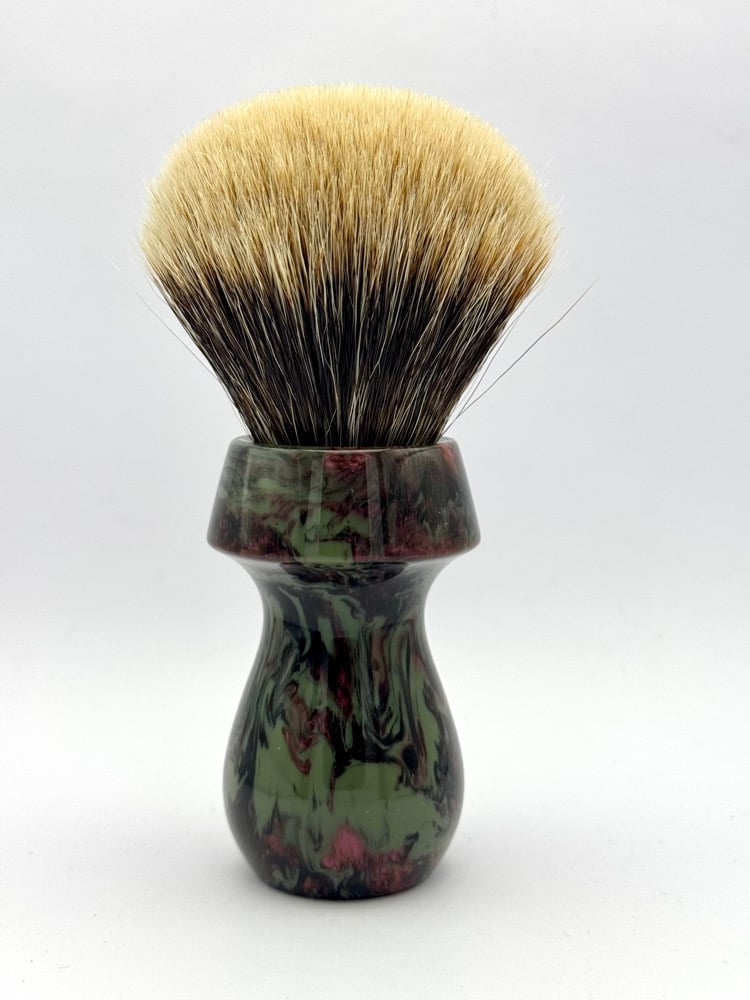 This is a hand turned and finished Resin shave brush handle. This comes with our new coin.